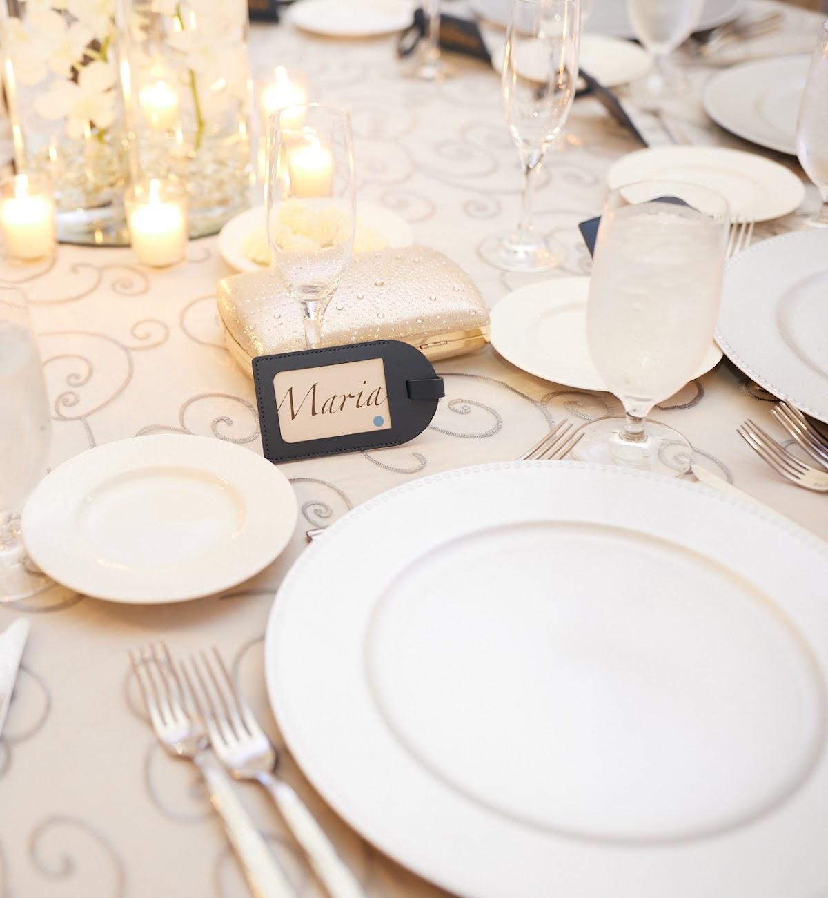 Floor-length table linens, napkins, glassware, chargers, presentation screens, and Chivari chairs.